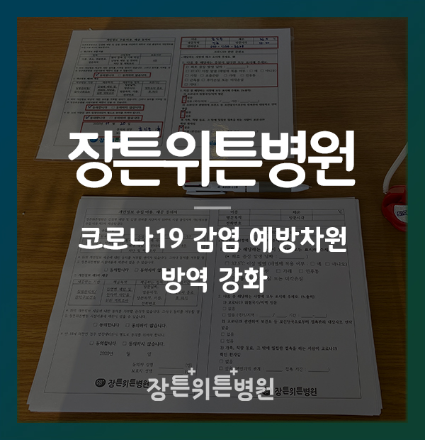 안녕하세요 장튼위튼병원입니다. ? 코로나 확산세가 연일 거세짐에 따라 수도권의 사회적 거리두기 또한 2단계로 격상되었는데요, ? 특히 연말은 건강검진 수검자가 병원에 몰리게 되는 시기로써, 철저한 방역과 감염관리가 그 어느 때보다 필요한 때입니다. 이에 장튼위튼병원은 코로나19 감염 확산 방지를 위해 예방대책 실시에 만전을 기하고 있습니다. "장튼위튼병원 안심하고 방문하세요"? 1. 안전한 의료진 전 의료진이 마스크 의무 착용 및 감염예방 교육 진행과 손위생 관리사항 준수 ? 2. 깨끗한 환경 병실 및 진료실 락스 소독 등 매일 철저한 원내 소독 실시 ? 3. 방역 강화 보다 철저한 내원객 코로나19 선별관리 ? ? 환자분들의 안전한 진료와 건강을 위해 항상 최선을 다하는 장튼위튼병원이 되겠습니다.